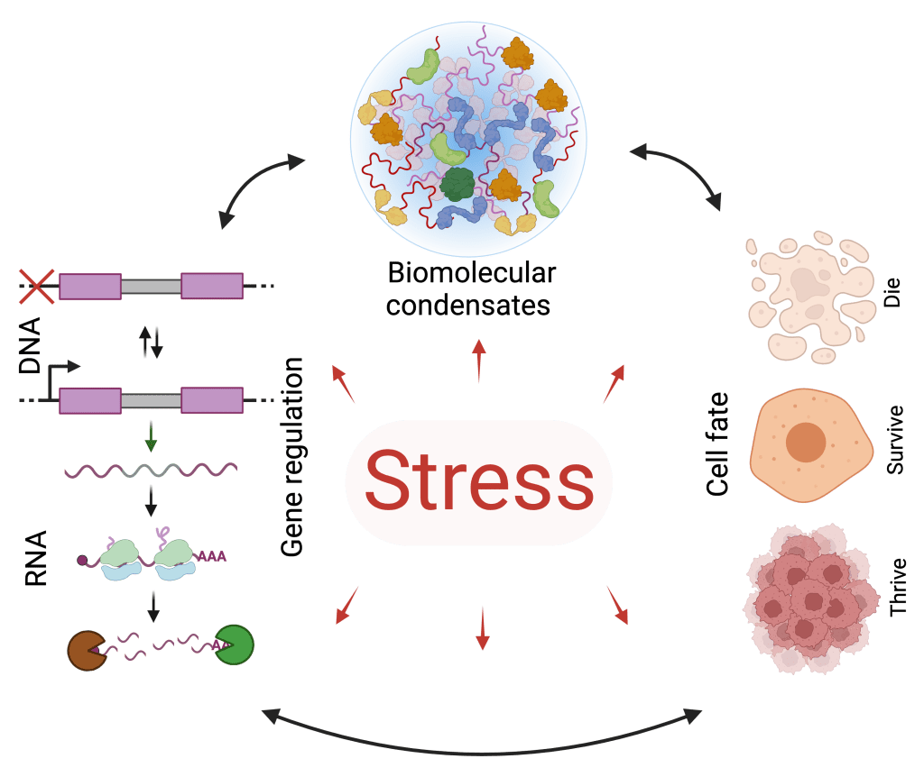 In response to stress, mammalian cells make one of three fundamental decisions – die, survive or thrive. Critical determinants of these seemingly distinct cell fates include the induction of signaling cascades and selective expression of perturbation-responsive genes, which together help restore ribostasis, proteostasis and cellular homeostasis. However, the mechanisms by which cells activate these processes and how cells selectively regulate gene expression to make survival decisions remains unclear. In addition, emerging evidence suggests that the dynamic reorganization of functionally nebulous, RNA- and protein-bearing, membrane-less compartments is an evolutionarily conserved hallmark of stress. Alterations in any of these stress response mechanisms are directly linked to aging and various (neurodegenerative and neoplastic) diseases. Elucidating the molecular bases of these aberrations and pathobiology will pave the way for new and effective diagnostics and therapeutics. Our lab seeks to understand how mammalian cells of various tissue contexts maintain homeostasis and how stress response programs influence cellular decisions in physiology and pathology.