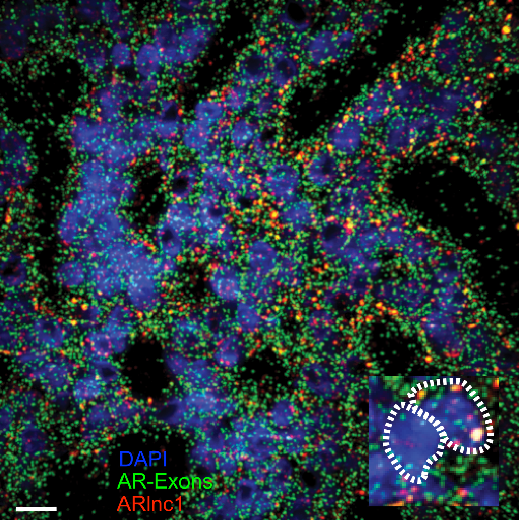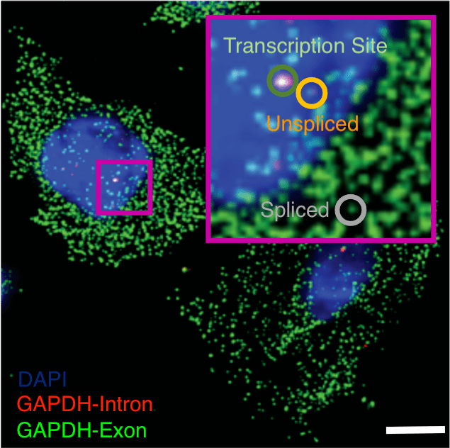 Interrogating gene regulation across spatial and biological scales. (Left – Right) Nanoscale imaging of GAPDH mRNA metabolism in U2-OS cells with single-molecule fluorescence in situ hybridization, scale 10 μm. Nanoscale imaging of the androgen receptor (AR) mRNA and AR-regulated long non-coding RNA (ARlnc1) in patient-derived, castration resistant prostate cancer sections using single-molecule fluorescence in situ hybridization, scale 30 μm. tSNE plots of cell types in the mouse lung, as annotated by single-nucleus RNA sequencing.